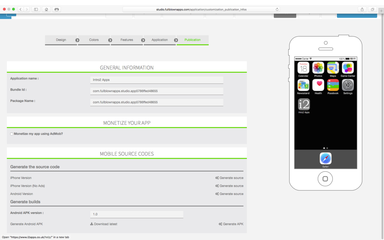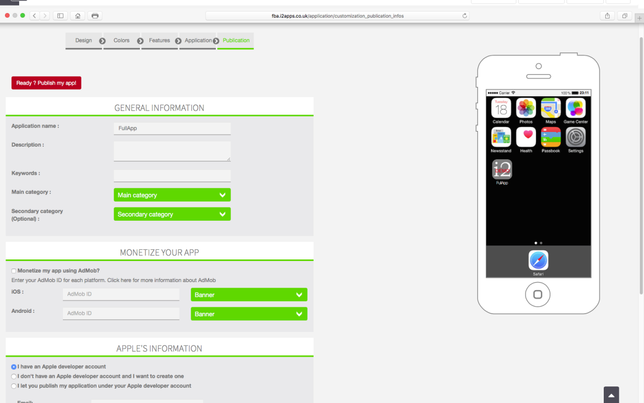 Auto-Publishing is the default publishing route when using our Full-Blown Apps facility. We will submit your app for publication on Google Play and Apple's App Store on your behalf. In the Publication section, enter the name and a description of your App (Avoid using any kind of sales pitch in your description or it will most likely be rejected by Google and Apple stores). Next, add some Keywords so that your App can be found easier. Keywords should be separated by a comma e.g., band,music,mp3 download, etc. Choose a Category suited for your App. The category you choose here is the category where your app will be listed on the app stores. If you intend using AdMob to make some money from advertising revenue, you should input your AdMob details in the relevant section for iOS and Android.