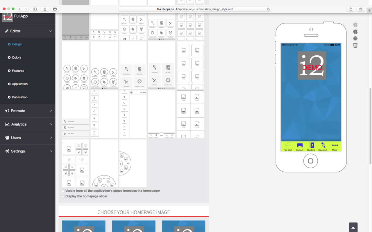 The Design screen is where you can choose a template for your app, pick the style of Menu upload custom app Image, and more.