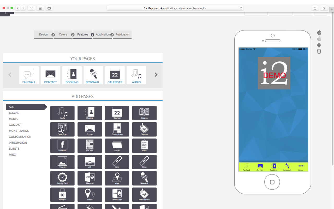 The Features screen is where you can add/edit the features of your app e.g., Newswall, Video, Contact etc.