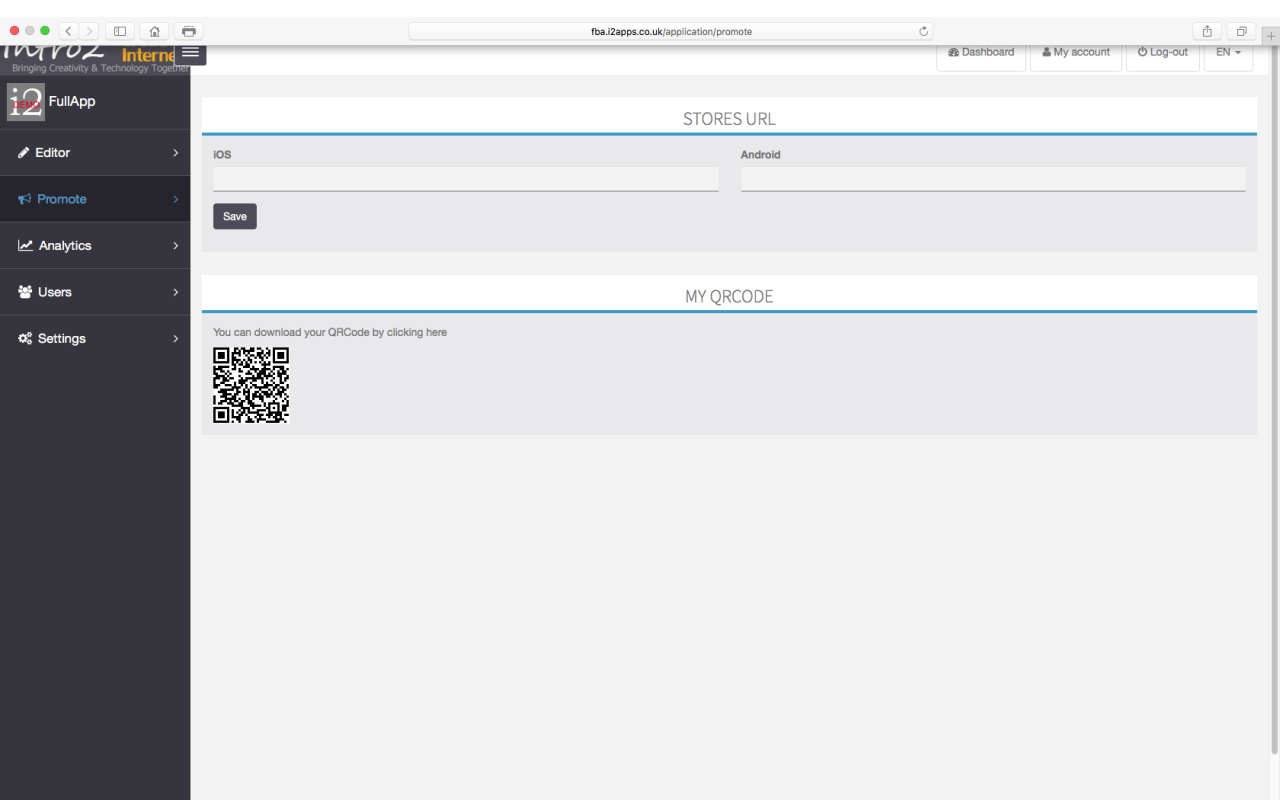 Once you have your App published on the stores, you can help promote your app by using your very own QR Code image. Just fill in the URLs where your app can be found then download your QR Code image. Using this image in your promotion materials will allow people to easily download your App from the appropriate store.