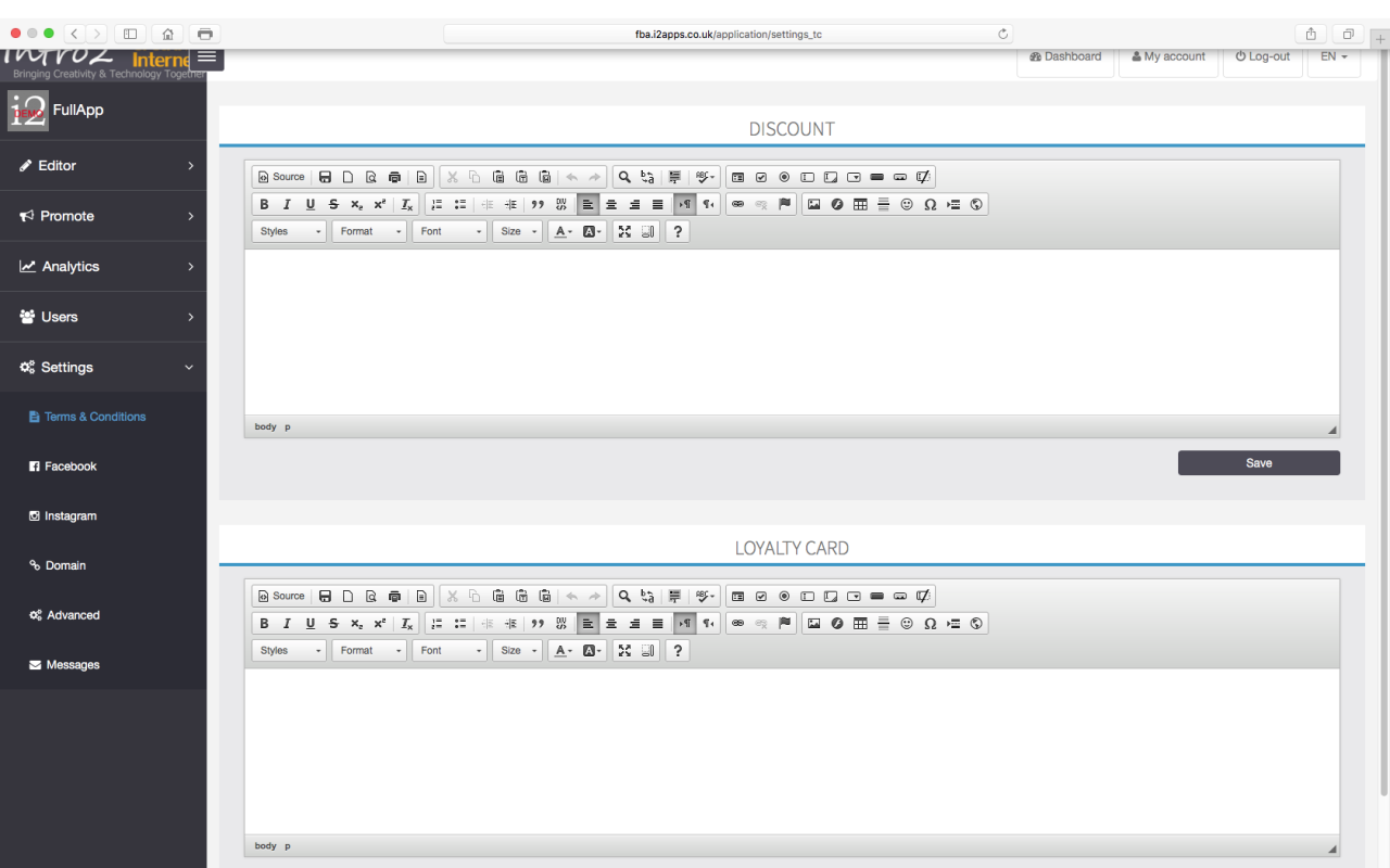 If you use Discounts or Loyalty features in your app, this screen allows you to provide your own Terms & Conditions for using your Loyalty or Discounts.