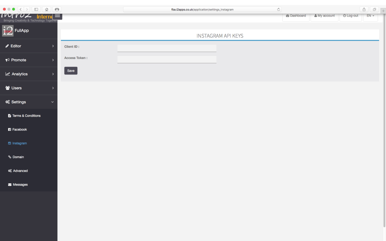 Input your Instagram API credentials here if you intend using Instagram-linked images in your app.